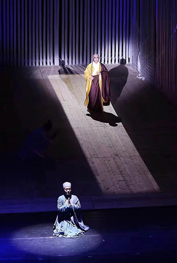 《鑒真東渡》講述了公元742年鑒真因日本國僧人邀請先后6次東渡,歷經(jīng)千辛萬苦終于在754年到達日本國,傳播中華文化這一史實,藝術(shù)再現(xiàn)了這段中日文化交流的千古佳話。此次彩排中,全劇通過一渡幻海、二渡愿海、三渡迷海、四渡覺海、五渡心海、六渡慧海六個部分,以真實的人物和虛幻的場景,藝術(shù)展現(xiàn)了鑒真東渡的艱辛歷程。在正式演出之時,揚州大明寺的仁如法師,也將會在舞臺邊上的蓮花座上吟誦佛法經(jīng)典,伴隨著劇情的發(fā)展,他將吟誦《大悲咒》、《心經(jīng)》等,為劇情推波助瀾。