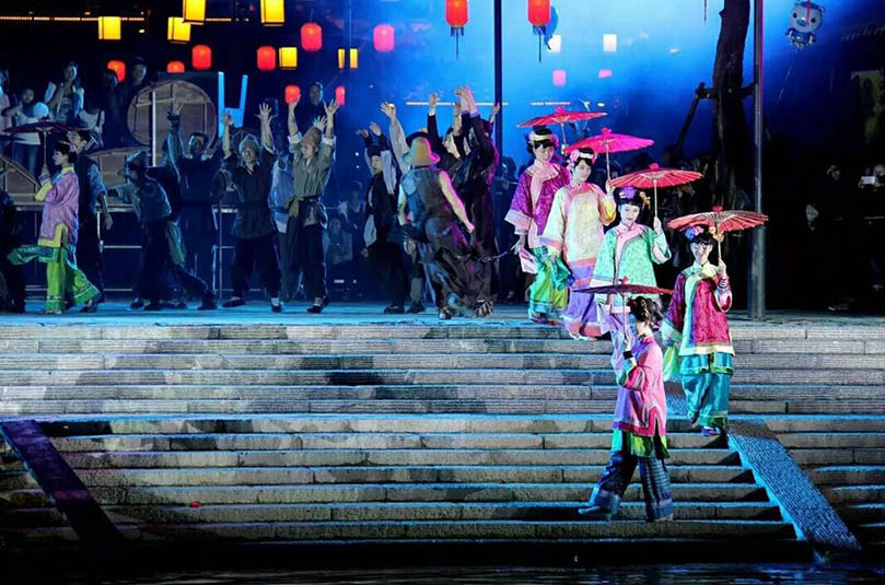 《夢回穿紫河》圍繞“河”“船”“人”三個關鍵詞,分“紫漁歌”、“依水筑城”、“河街舊事“、“浪漫之旅”四個篇章,利用大船、燈光、煙花等元素,將常德文化與現(xiàn)代機械光電技術結合,還原包括“古河”、“桃花源”、“沅水號子”等文化藝術印象,將觀眾帶入一個光與影交相輝映、水與人和諧共存的美好境界。乘坐“水上巴士”沿著11公里長的穿紫河河道游覽,享受常德老河街原景、折子戲、常德絲弦、劉??抽砸魳穭〉葘嵕把莩?,再配合燈光特效等高科技手法,常德本地民俗文化與現(xiàn)代科技的完美結合,打造出一場古典與現(xiàn)代結合的唯美大賞。