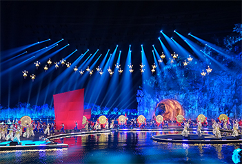 桂林象鼻山是今年央視春晚分會(huì)場(chǎng)之一,在舞臺(tái)搭建方面,以象鼻山作為整個(gè)舞臺(tái)的天然背景,突出象鼻山這一桂林山水文化元素,打造有“象山水月”寓意的舞臺(tái)效果。以山與水結(jié)合作為演出舞臺(tái),舞臺(tái)燈具沒(méi)有辦法在水面上或者半空中搭建桁架,為此次戶(hù)外實(shí)景演出增加極大的難度。