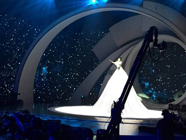浩洋電子切割燈V3000P設(shè)置于舞臺面光和頂光位,染色燈V2000W則主要擔(dān)負(fù)大范圍鋪光染色效果,上圖是切割燈V3000P在晚會上的精彩表現(xiàn),女神趙雅芝在聲光電制造的舞美效果中,優(yōu)雅獻(xiàn)唱,效果非凡。