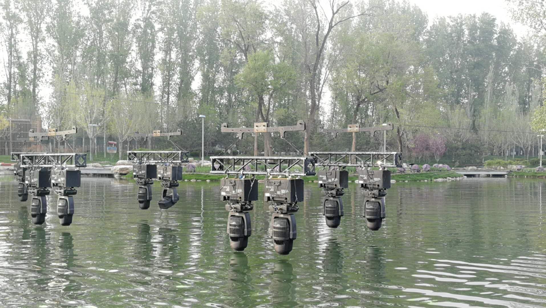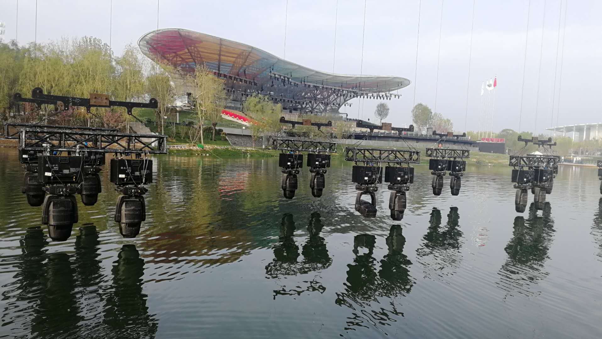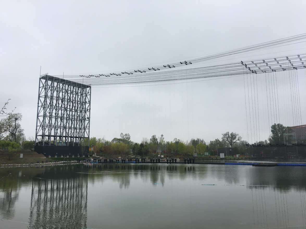 為了承載背景網(wǎng)屏和燈光設備,開幕式專門臨時搭建了兩座鋼結(jié)構(gòu)威亞塔架,塔高39米,塔間跨度280米。塔間共搭設重型威亞索道16套,吊點總數(shù)218個。使用威亞控制系統(tǒng)將藝術空間擴展升華,空中矩陣隱形LED屏幕、空中矩陣數(shù)控飛燈等與地面舞臺表演完美結(jié)合,給觀眾帶來超強的視覺震撼效果。