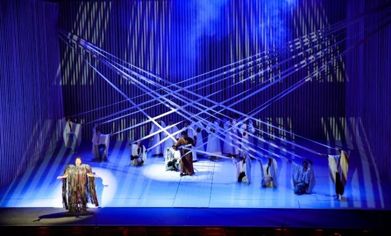與一般的歌劇戲劇結構方式有所不同,歌劇《鑒真東渡》有著不拘泥情節(jié)意識流般的戲劇鋪陳,通過多元的音樂并列和抽象的舞臺寫意呈現(xiàn),著力渲染表達鑒真內(nèi)心的情感波濤和人生理念。