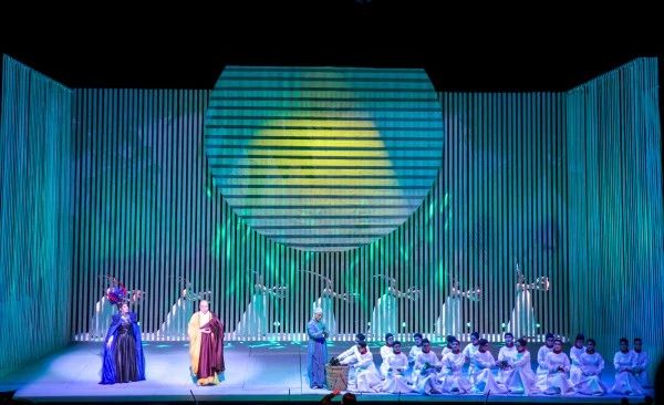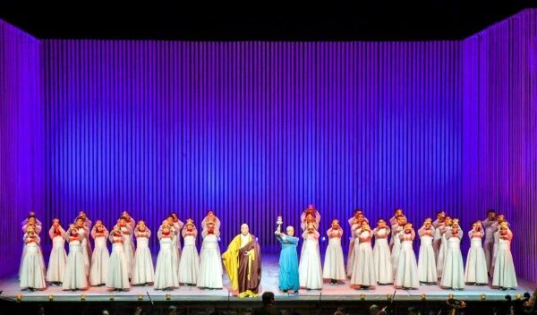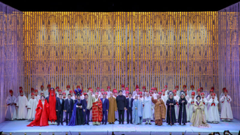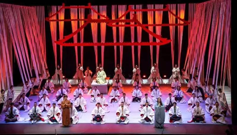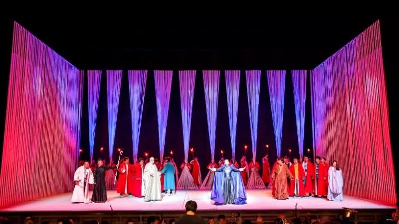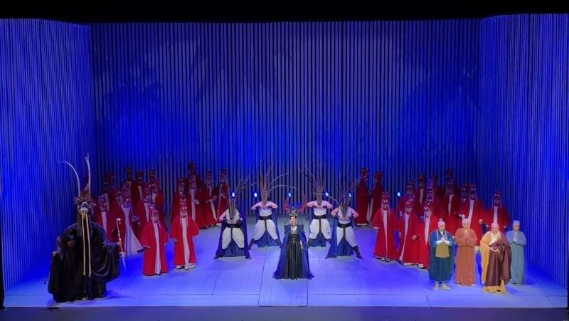 《鑒真東渡》運用歌劇這一國際通識的藝術表達話語,配合有感染力的表演,富有創(chuàng)意的舞美燈光設計,生動、立體的人物架構,在遵循歌劇藝術規(guī)律的基礎上,創(chuàng)造性地將江蘇民歌元素和佛教音樂的旋律融入其中,讓歌劇更富有地域特色,呈現(xiàn)出不同于純粹西方歌劇的風格,展現(xiàn)出東方所特有的歷史厚重感與人文風貌。