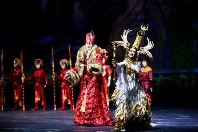 演出中的很多形象都有著東西方文化的雙重印記。主人公的形象既能讓觀眾聯(lián)想到孫悟空也帶著西方傳統(tǒng)神話的人物印記。劇中有東西方兩個(gè)王國(guó),西方的是以龍和紅色元素來(lái)代表,而東方的則以鳳凰和金色元素來(lái)代表。
